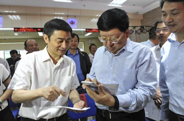 图为 湖南省委常委、常务副省长陈向群通过手机现场操作“互联网+发票有奖”发票辨伪系统