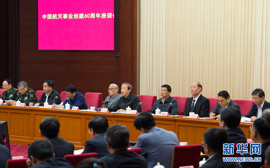 10月12日,中国航天事业创建60周年座谈会在北京召开。中共中央政治局委员、国务院副总理马凯出席座谈会并讲话,国务委员王勇出席座谈会。新华社记者谢环驰摄