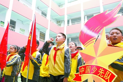 10月12日,山东省枣庄市君山路小学开展“红领巾相约中国梦——听党的话,做好少年”活动。少先队员们在队旗下宣誓、唱《中国少年先锋队队歌》,接受爱国主义教育,迎接10月13日中国少年先锋队建队67周年的到来。图为少先队员在队旗下重温入队誓词。