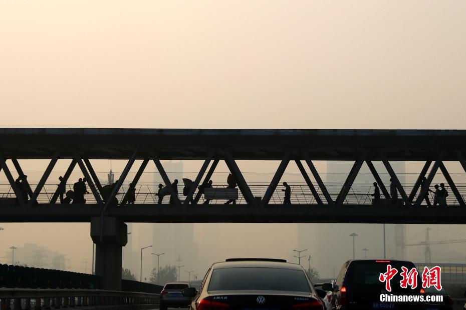 10月13日,北京市民霾中出行。当日下午16时,北京市空气重污染应急指挥部办公室发布空气重污染蓝色预警。北京市及华北地区受不利气象条件影响,污染物积累明显,空气质量达到重度污染水平,根据预报,14日仍将维持不利气象条件,空气质量为重度污染。 中新社记者 富田 摄