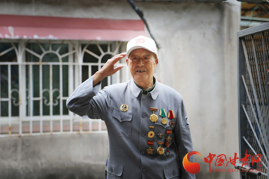 敬礼的余新元老人身后就是他生活的院子 张文良 摄