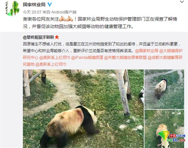 近日,微博网友曝光一组兰州动物园大熊猫“蜀兰”疑似有伤的图片,引发大量网友关注。@国家林业局 回应表示,国家林业局野生动物保护管理部门正在调查了解情况,并督促该动物园加强大熊猫等动物的健康管理工作。
