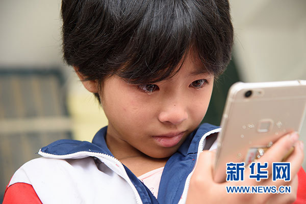 贵州毕节市黔西县绿化乡的留守儿童李淑银和外出打工的父亲视频聊天后哭泣(9月13日摄)。新华社记者刘续摄