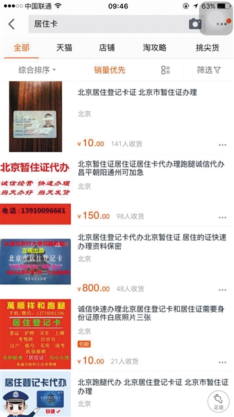 其中,网络代办居住登记卡最低要800元,最高则为1500元,“1500元的当天就可以拿卡,800元的则需要2到3天的时间。”淘宝店铺的一名客服人员表示。