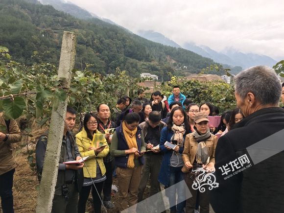 光明村党支部书记庞仁斌向采访团介绍猕猴桃种植基地情况。 记者 黄宇 摄
