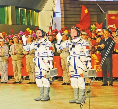 10月17日,神舟十一号航天员出征仪式在酒泉卫星发射中心举行。图为航天员景海鹏(右)、陈冬在出征仪式上挥手。张立新摄/光明图片