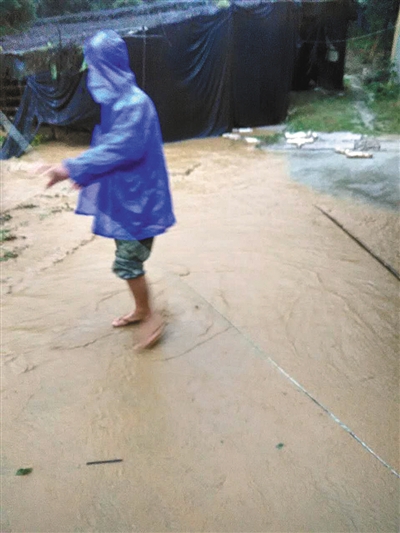 此时水位已经漫到水泥路面上。住在溪流拐弯处的林喜球听到水里大石头碰撞的声音,也起来了。打算做早饭的她,却发现溪水卷着淤泥从沿溪的后门涌入,原本是下水道的管口也开始漫入土黄色的溪水。仅仅是五到十分钟的时间,水位就从刚漫过路面上涨到膝盖处,地上的泡菜坛子也被推倒。