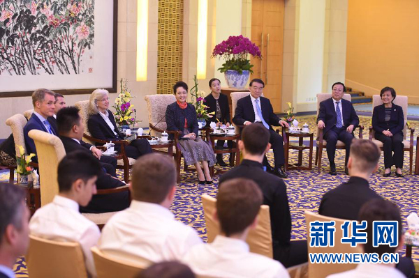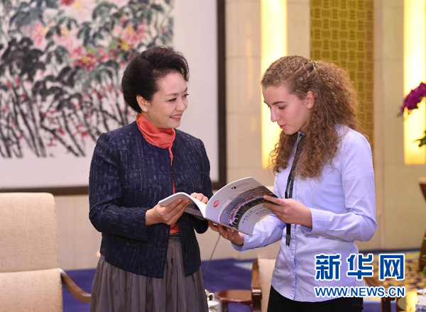 10月19日,中国国家主席习近平夫人彭丽媛在北京钓鱼台国宾馆会见德国伯乐高级文理中学师生。 新华社记者 谢环驰 摄