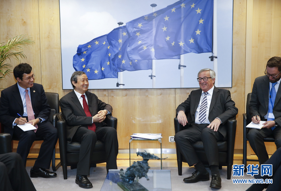 10月18日,在比利时首都布鲁塞尔欧盟委员会总部,出席第六次中欧经贸高层对话的国务院副总理马凯(左二)会见欧盟委员会主席容克(右二)。新华社记者叶平凡摄