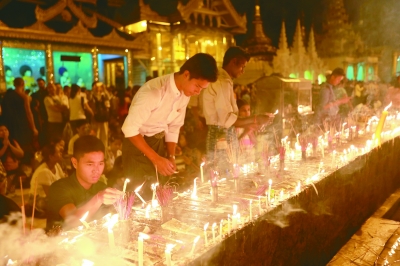 图为10月16日,缅甸民众和僧侣聚集在仰光市中心大金塔,欢度缅甸传统节日——点灯节。大金塔及其周边区域被节日的人流挤得水泄不通,热闹非凡,整个仰光的夜晚被笼罩在一片热闹祥和的气氛之中。缅甸的点灯节通常在缅历七月月圆之日举行。据佛教传说,佛祖释迦牟尼曾于缅历的四月十五日至七月十五日为众神讲经,七月月圆的时候,释迦牟尼在众神的簇拥之下来到人间,缅甸人民便点上各种彩灯和蜡烛迎接。本报驻仰光记者 李司坤摄/光明图片