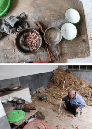 在河南省驻马店市西平县于营村,双目失明的于二稳自己摸索着去“厨房”。他是个单身汉,借宿在侄子的空房子里,邻居隔段时间会帮他买些菜(拼版照片)。冯大鹏 摄