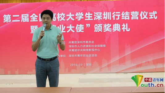 共青团深圳市委员会书记刘广阳在“第二届全国高校大学生深圳行”举行结营仪式上讲话。中国青年网通讯员 韩非吾摄。