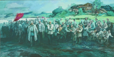 昆明西山国际艺术交流中心艾维美术馆展出的以巧渡金沙江为题材的大型油画作品。杨峥摄/光明图片/视觉中国