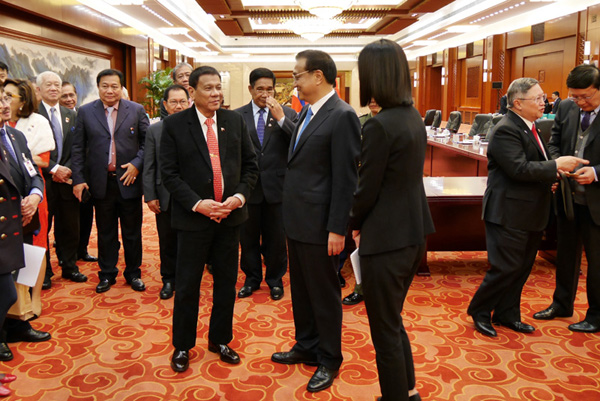 在会见即将进入尾声的时候,李克强对杜特尔特表示,明年菲方将担任东盟轮值主席国。中方愿意以此为契机,加强同菲方在中国—东盟框架下的沟通、协调与合作,把握好中国—东盟关系发展大方向,推动双方合作不断向前发展。