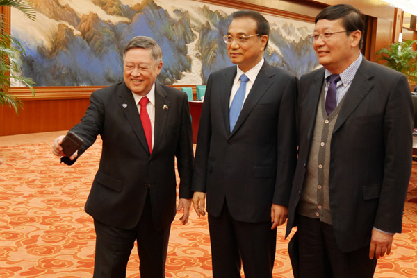 李克强开门见山说:“很高兴再次和总统先生见面。一个多月前我们在老挝见面、交谈,我当时就感受到了你愿意改善和发展中菲关系的诚意。”