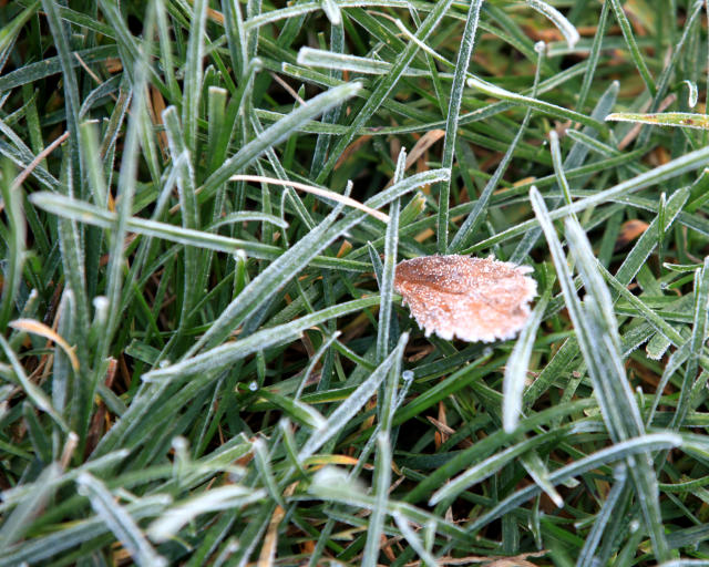 10月23日清晨,内蒙古呼和浩特市满都海公园的小草凝露为霜。CICPHOTO/魏月飞 摄