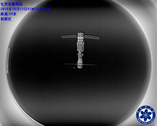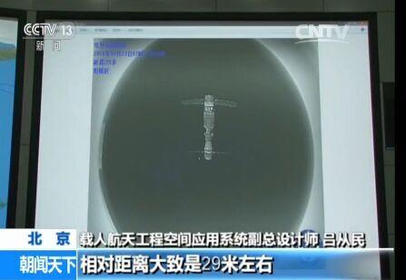 载人航天工程空间应用系统副总设计师 吕从民:这幅图是伴飞卫星释放初期,获取的一幅组合体的红外影像,这个相对距离大致是29米左右,从这张图中可以看到,上半部分是天宫二号,下半部分是神舟飞船,大家看到图像的上部有几块局部区域颜色比较浅一些,就是一些对地一些设备处于工作状态。