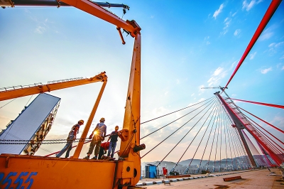 重庆市丰都县正在建设中的丰都长江二桥(名山大桥)基础建设接近尾声。该桥全长2165米,桥型结构为双向四车道双塔双索面钢箱梁斜拉桥,项目总投资12.9亿元,将于年底建成通车。图为10月23日,工人在拆除辅助吊装设施设备。陈勇摄/光明图片