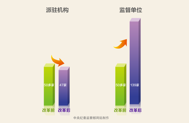 改革前,中央纪委监察部共在50多家中央和国家机关设置了派驻机构,且主要是向政府部门派驻,没有向党的工作部门派出纪检组,也没有向人大、政协机关派驻,监督留了不少空白,有的空白恰恰是要害部门。随着派驻机构改革深化,派驻机构减少到47家,却实现了对139家中央一级党和国家机关的派驻全覆盖。与改革前相比,派驻监督覆盖单位增加80多家,派驻机构数量反而减少了,真正做到了精简高效。