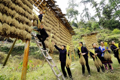 10月25日,广西龙胜各族自治县乐江乡地灵村侗族群众在晾晒糯谷。时下,正是糯谷成熟季节,当地群众家家户户将禾把晾晒在村头的禾廊上,构成了一幅独特的乡村风景。