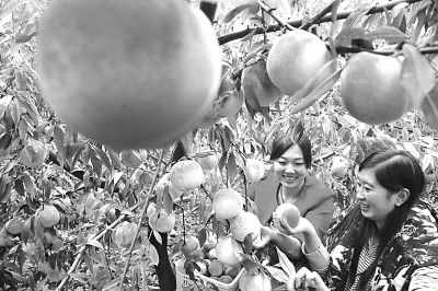 10月26日,游客在山东省淄博市博山区源泉镇采摘映霜红桃。该镇近年来大力发展映霜红桃等特色种植,500多亩映霜红桃目前进入成熟上市期。秦强摄/光明图片