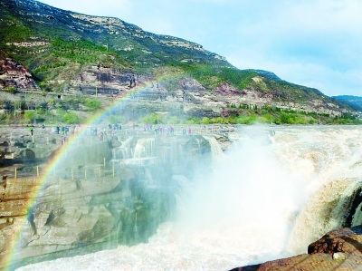 10月26日,受黄河上游持续降水影响,位于晋陕大峡谷的壶口瀑布水流湍急,瀑布上方出现美丽的彩虹景观,吸引游人争相观看、拍照留念。