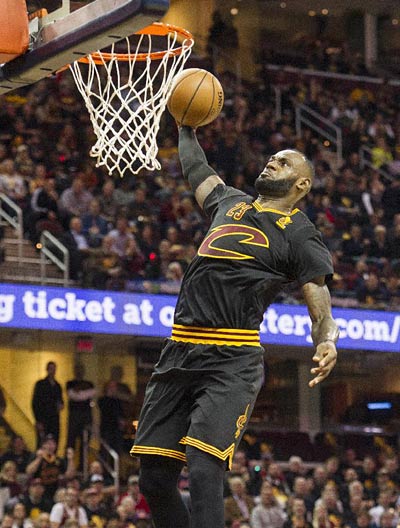 NBA2016-2017赛季25日揭开战幕。在联赛揭幕战中,卫冕总冠军骑士队以117:88主场横扫纽约尼克斯队,赢得开门红。圣安东尼奥马刺队129:100大胜金州勇士队,搅乱了杜兰特在新东家的首秀。图为骑士队球员詹姆斯在比赛中扣篮。