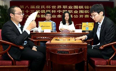 10月26日,中国棋手唐韦星(左)和韩国棋手朴廷桓在比赛中。当日,在第八届应氏杯世界职业围棋锦标赛五番棋决赛第五局比赛中,中国棋手唐韦星击败韩国棋手朴廷桓,以总比分3比2夺得冠军。