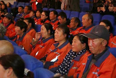 10月26日,在河北省张家口市工人文化宫,环卫工人在观看电影《爱的红围巾》。当日是环卫工人节,一部反映环卫工工作、生活题材的电影《爱的红围巾》在河北张家口首映,100余名环卫工人参加活动并观影。电影讲述了一名大学毕业生为完成母亲遗愿走上环卫工岗位并最终成长为一名出色环卫工的故事。
