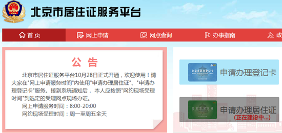 北京市居住证服务平台网站于今天开通。根据该网站公示内容显示,群众可在网上申请服务时间内使用“申请办理居住证”、“申请办理登记卡”服务。在填写申请接到系统通知后,本人应按照“网约现场受理时间”到选定的受理网点现场办证。目前根据该网站显示,办理登记卡服务已开通,办理居住证项目则仍显示正在建设中。