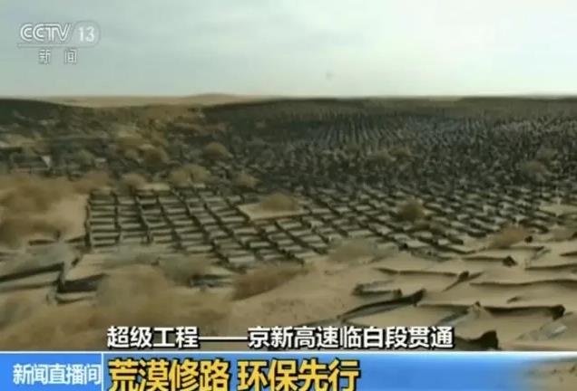 工人将装满沙子的沙袋依次摆放到公路两侧,呈田字形交叉叠放。形成了一个个一平方米的小方格,连成一片。沙袋在设计上是有鳍沙袋,编织袋边沿都会留出来三公分长的穗子。这样的设计不但能减缓风速,还能把吹起的沙留在框格内,起到固沙作用。除了在公路两侧铺设沙袋固沙,工程队还在沙袋外围设置了高立式沙障和阻沙堤,构成了一个整体的防沙系统,将流动沙丘阻隔在外。