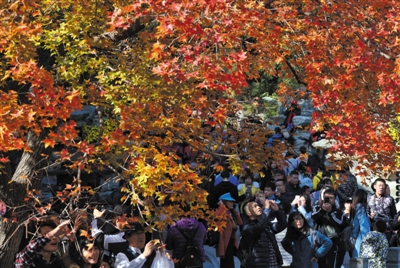 昨日,香山,游客们在红叶下游玩,周末天气晴朗,香山迎来游客高峰。记者从香山公园了解到,香山红叶变色率已达60%,尤其是海拔较高的香炉峰、森玉笏等处变色率已接近80%。即日起至11月中旬,香山公园已进入赏红时间,香山公园推出五处最佳赏红点,包括香炉峰、青未了等景区。新京报记者 薛珺 摄