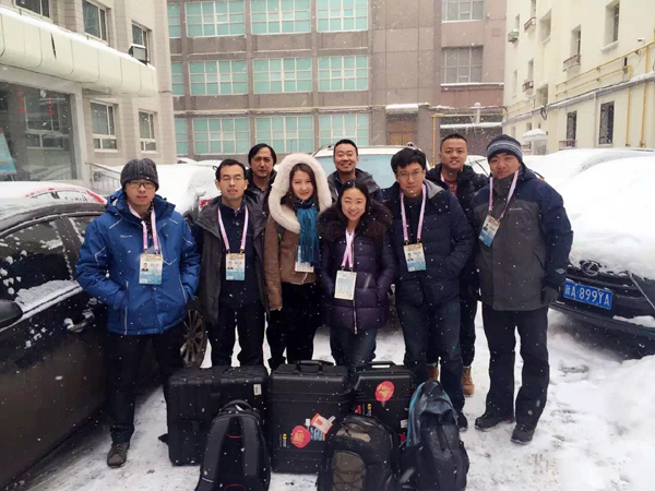 图为2016年的风雪中,记者与同事们一道参与在乌鲁木齐举办的“第十三届全国冬季运动会”报道。