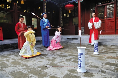 几位学生正在练习投壶。10月23日,金融街社区教育学校成立十周年之际,学校设置了国学、民乐、书画、钢琴、声乐、舞蹈一系列活动,庆祝十周岁生日。