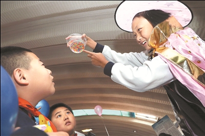 10月31日,北京市东城区灯市口小学六年级(3)班学生武明昭(右)在给同学展示化学实验“水精灵”。本报记者 鲍效农 摄