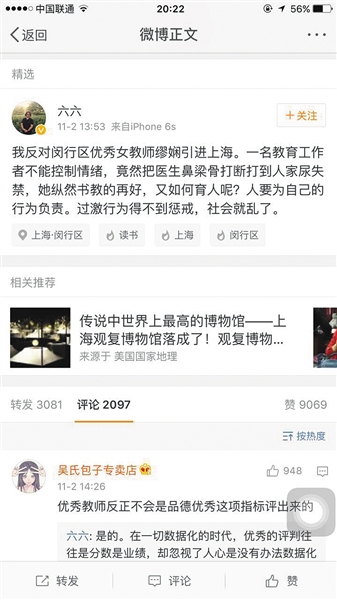 网友表示难以接受这样的人落户上海。知名女作家六六也发布微博表示反对缪某落户。“一名教育工作者不能控制情绪,竟然把医生鼻梁骨打断打到人家尿失禁。人要为自己的行为负责。过激行为得不到惩戒,社会就乱了。”六六在微博中表示。落户时需审核申请人是否有犯罪记录,多名网友质疑,“缪某打人打到骨折,最后为什么没有案底?如果有案底,她是如何开出无犯罪记录证明的?”