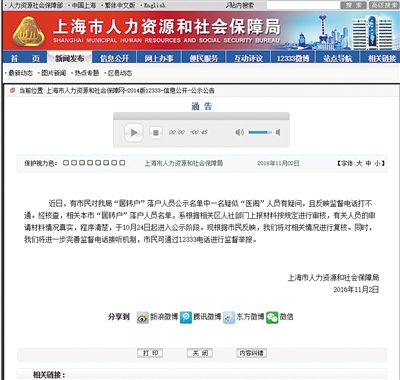 上海市人社局在网站上发布相关通告。