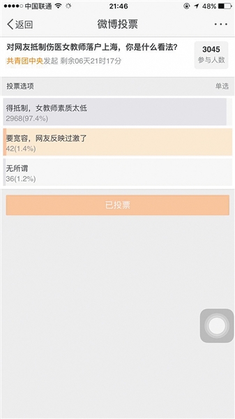 昨晚,共青团中央官方微博就此事件发起投票。3个小时内有三千余人参与投票,其中97.5%的投票者认为,此事件中“女教师素质太低,得抵制。”