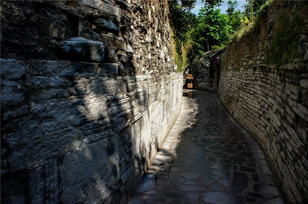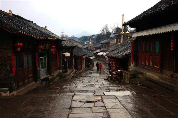 背街是青岩最具特色的一条石巷,街边是层层片石垒起的院墙,路面的青石板经过几百年的冲刷磨砺,如镜面般光可鉴人,路窄而幽静,给街巷带来一种独特的时空感与神秘感。
