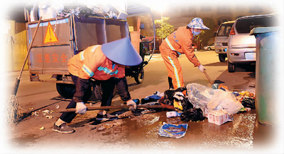 十月三十日清晨,广西钦州市钦北区环卫工在清理垃圾。新华社记者 张爱林摄