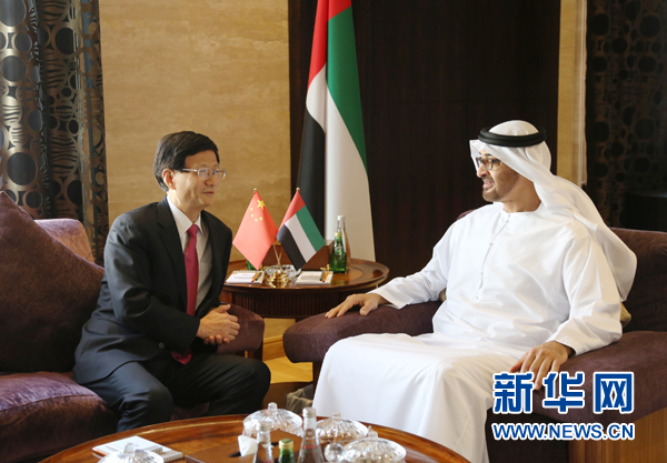 11月7日,在阿联酋阿布扎比,习近平主席特使、中共中央政治局委员、中央政法委书记孟建柱(左)会见阿联酋阿布扎比王储穆罕默德。新华社记者李震摄