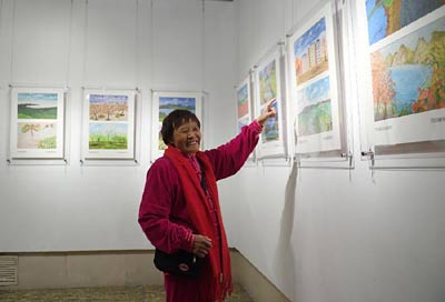 11月8日,西高庄村村民王凤引介绍自己的绘画作品。当日,“西高庄人的幸福生活”画展在北京中华世纪坛开幕。展出的202幅绘画作品均出自河北省保定市莲池区西高庄村村民之手,他们用画笔描绘多彩的村庄、美好的愿景及对生活的热爱。