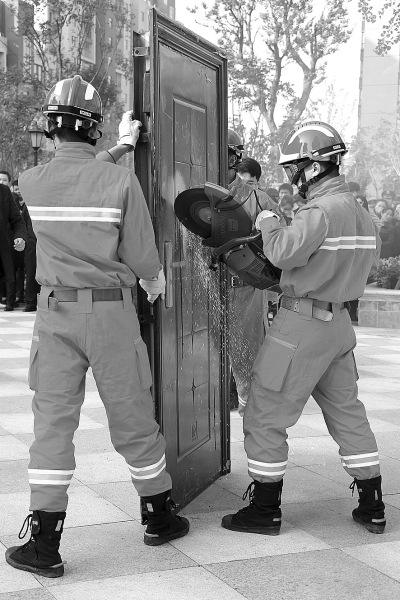 11月8日,山东省枣庄市在薛城区优山美地小区举行枣庄市“119”消防安全宣传月活动启动仪式。图为消防官兵在现场演示破拆防盗门。 孙中喆摄/光明图片