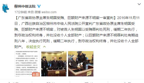 人民网北京11月11日电 据广西壮族自治区柳州市中级人民法院官方微博消息,2016年11月11日,广西壮族自治区柳州市中级人民法院公开宣判广东省政协原主席朱明国受贿、巨额财产来源不明案,对被告人朱明国以受贿罪判处死刑,缓期二年执行,剥夺政治权利终身,并处没收个人全部财产;以巨额财产来源不明罪判处有期徒刑八年,决定执行死刑,缓期二年执行,剥夺政治权利终身,并处没收个人全部财产。
