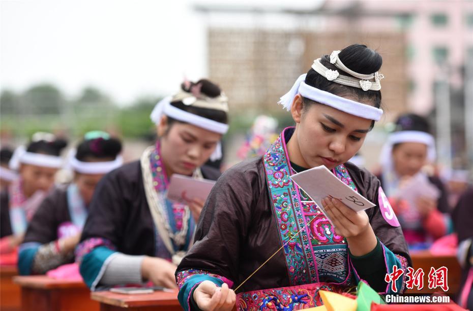 11月12日,广西三江侗族自治县举行刺绣大赛,200名侗族绣娘同场比拼“绣技”。根据规则,参赛绣娘同绣大小相同的图案,一个小时内看谁绣得又快又好。三江侗绣是一种集纺织、印染、剪纸、刺绣于一体的传统工艺,绣品不仅图案精美、色彩艳丽,还具有极高的装饰和收藏价值。龚普康 摄