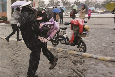 风雪中把孩子抱过泥泞:2011年1月20日早晨,雨雪交加,骑电动车的谢才保摔了好几跤,赶到学校门口时已是7点30分,虽然最高峰已过,但陆旭东还是一头汗地忙碌着,抱孩子过马路的他,警服上沾满了泥浆和雪水。