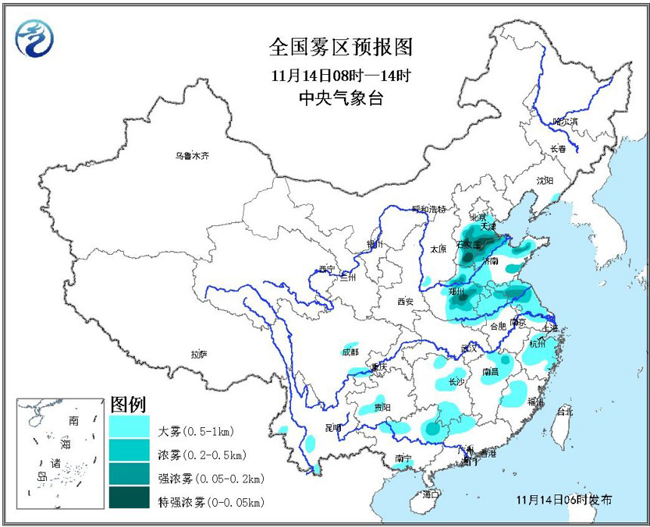 此外, 14日早晨至上午,天津南部、河北中南部、河南中东部、山东西部和北部、安徽北部、江苏中北部等地有大雾,其中,河北中南部、河南东部、山东西北部、苏皖北部等地的部分地区有能见度低于200米的强浓雾,局地有能见度不足50米的特强浓雾。中央气象台11月14日06时发布大雾橙色预警。