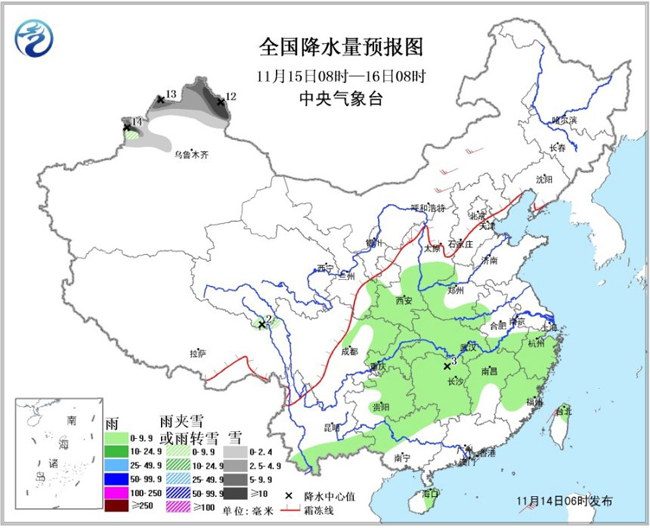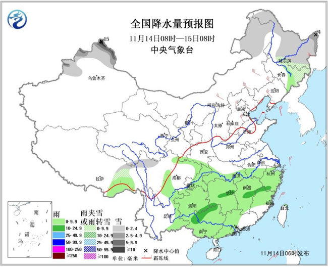 14日08时至15日08时,内蒙古东北部、东北地区中北部、新疆北部等地有小到中雪或雨夹雪,其中新疆北部阿勒泰地区和塔城等地有大到暴雪;西南地区东部、江南、华南中西部等地有小到中雨。内蒙古中东部、东北地区大部、华北、黄淮东部等地有4~6级风。