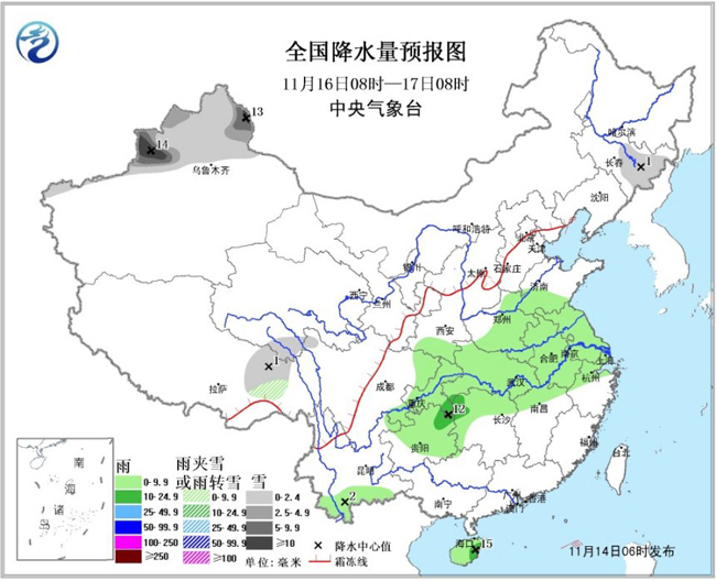 16日08时至17日08时,新疆北部、吉林东部等地有小到中雪或雨夹雪,其中,北疆东北部及伊犁河谷等地的部分地区有大到暴雪;黄淮中西部、西北地区东南部、西南地区东部、江汉、江淮中西部、江南北部和西部、海南岛等地的部分地区有小雨或阵雨,局地中雨。