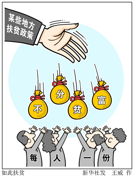记者在山西的一个贫困村遇到这样一件事。去年村里用扶贫资金买了一批扶贫羊,本打算分给贫困户,让他们养羊脱贫。但村干部生怕分配不公引发矛盾,干脆全村每人分一只,剩下的又6人合分一只。结果仅大半年时间,这些羊就被村民们卖了一多半,没起到预期扶贫效果。